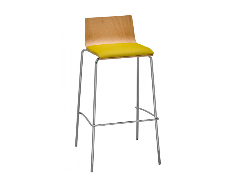 Celodřevěná stohovatelná barová židle s nízkou zádovou opěrkou a čalouněným segmentem sedáku. Buková skořepina je posazena na čtyřnohém chromovém rámu s barem pro nohy.