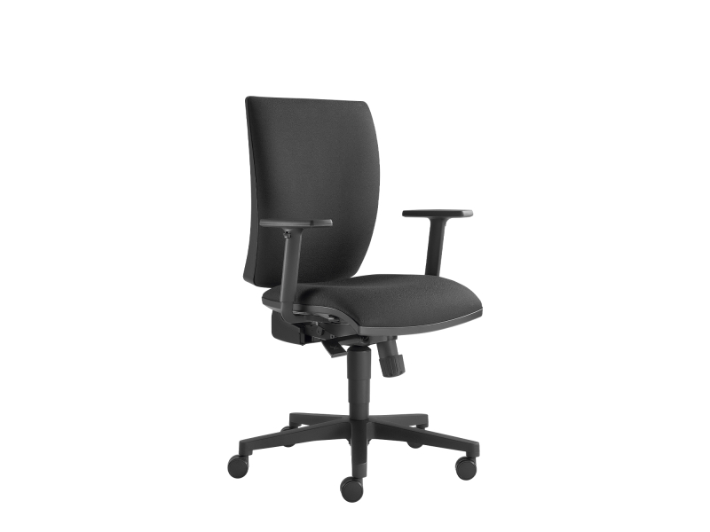 synchronní mechanika SY s nastavením tuhosti odporu opěráku pod sedákem, 3x aretace, 5-ramenný nylonový kříž, černý, otočná pracovní židle, výškově stavitelná, čalouněný sedák a opěrák, výškově stavitelný opěrák, černý nylonový kryt opěráku, základní verze bez područek, kolečka na koberce, černá, Ø 55 mm
