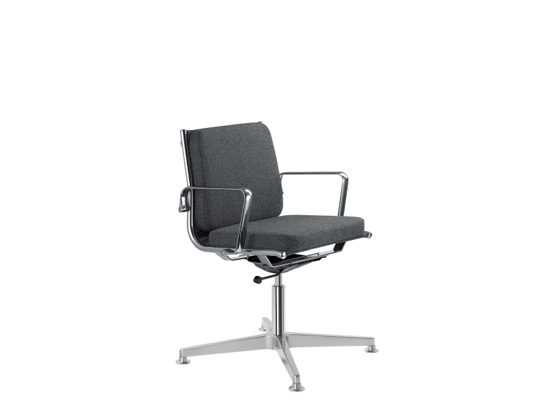 plastové kluzáky, výškově stavitelné, nízký opěrák, otočné pracovní křeslo, 4-ramenný hliníkový kříž, leštěný, hliníkové područky, pochromované, ocelový rám sedáku a opěráku v provedení chrom, čalouněné polštáře sedáku a opěráku