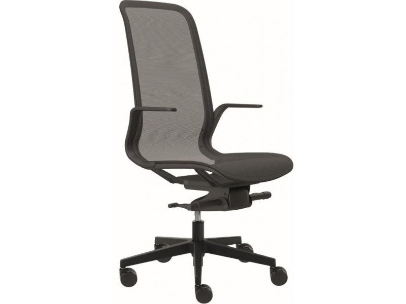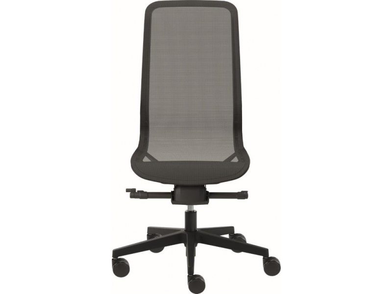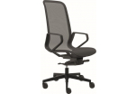 Elegantní kancelářská židle v černém síťovaném provedení, se subtilní designovou konstrukcí.
