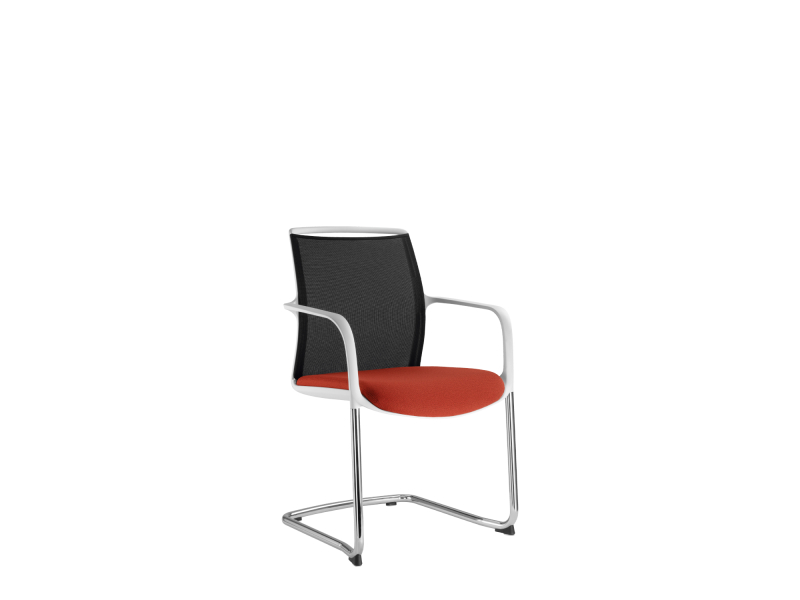 ocelová pérová podnož v povrchové úpravě chrom, konferenční židle, stohovatelná, čalouněný sedák, síťovaný opěrák, bílý nylonový rám, nylonové područky, bílé, opěrák čalouněný síťovinou NET, nebo RIB, za příplatek SWING, nebo RAY, plastové kluzáky na koberce se snadno vyměnitelným zakončením