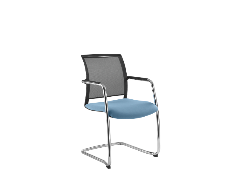 ocelová pérová podnož v povrchové úpravě chrom, konferenční židle, stohovatelná, čalouněný sedák, síťovaný opěrák, područky s plastovým loketníkem, černý nylonový rám, opěrák čalouněný síťovinou NET, za příplatek RAY, plastové kluzáky na koberce se snadno vyměnitelným zakončením