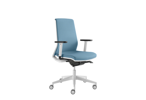 synchronní mechanika SYS s bočním nastavením tuhosti odporu opěráku, 5x aretace, otočná pracovní židle, výškově stavitelná, čalouněný sedák a opěrák, základní verze bez područek, 5-ramenný nylonový kříž, bílý, kolečka s pryží na tvrdé podlahy, bílá, Ø 55 mm, bílý nylonový rám opěráku a kryt sedáku, bílá krytka pístu, výškově stavitelná bederní opěrka, opěrák ze zadní pohledové strany čalouněný černou nosnou síťovinou, z opěrné strany látkou