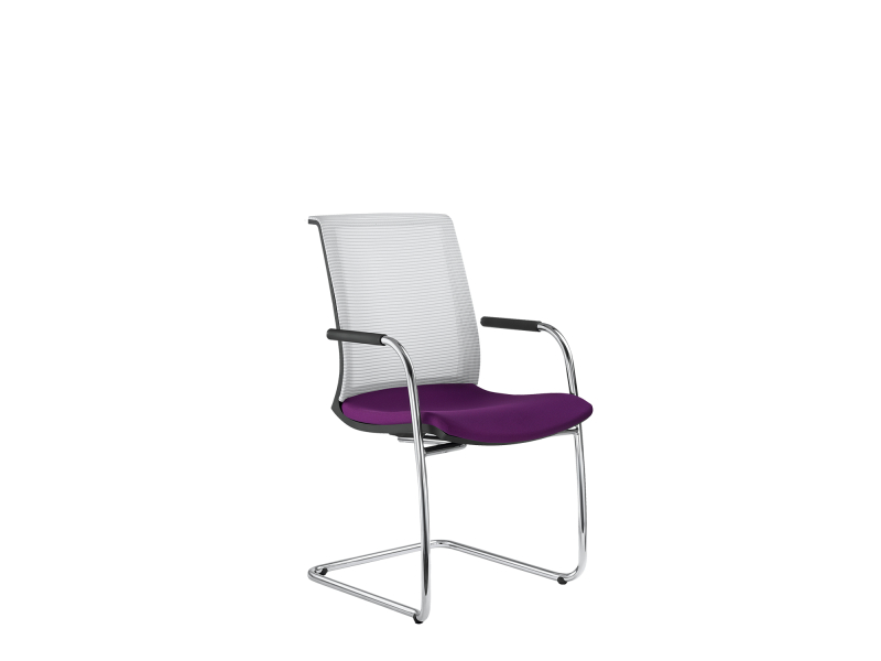 ocelová pérová podnož v povrchové úpravě chrom, konferenční židle, stohovatelná, čalouněný sedák, síťovaný opěrák, područky s černým PUR návlekem, černý nylonový rám, opěrák čalouněný síťovinou NET, nebo RIB, za příplatek RAY, SWING, THEO NETS, OMEGA, nebo RHYTHM, teflonové kluzáky na koberce