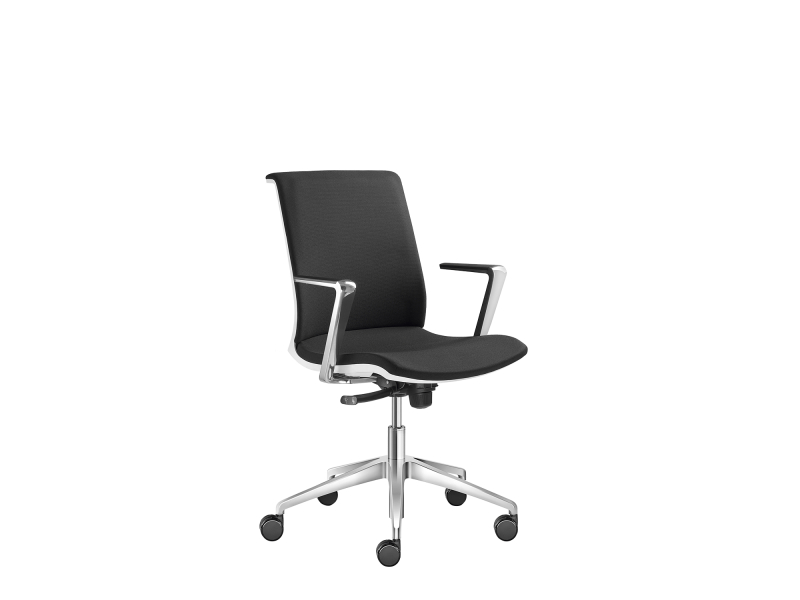 kolečka na koberce, černá, Ø 60 mm, výškově stavitelná, čalouněný sedák a opěrák, základní verze bez područek, 5-ramenný hliníkový kříž, leštěný, otočná konferenční židle, houpací mechanika s nastavením tuhosti odporu pod sedákem a možností aretace ve výchozí pozici, bílý nylonový rám, bílý nylonový kryt opěráku
