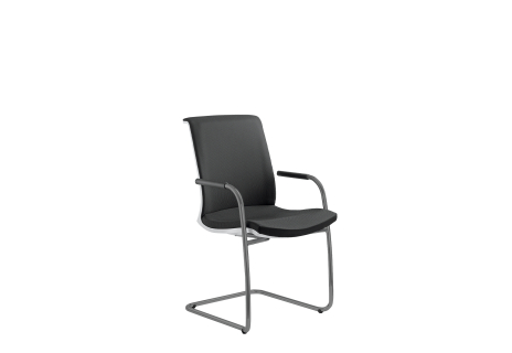čalouněný sedák a opěrák, konferenční židle, stohovatelná, ocelová pérová podnož v povrchové úpravě šedá prášková barva (RAL 9006), područky s černým PUR návlekem, bílý nylonový rám, bílý nylonový kryt opěráku, teflonové kluzáky na koberce
