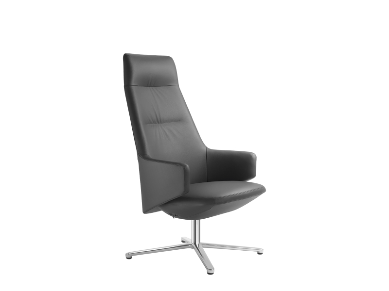 čalouněný sedák a opěrák, plastové kluzáky, vysoký opěrák, 4-ramenný hliníkový kříž, leštěný, houpací mechanika s možností aretace ve výchozí pozici, čalouněné područky součástí opěráku, otočné křeslo