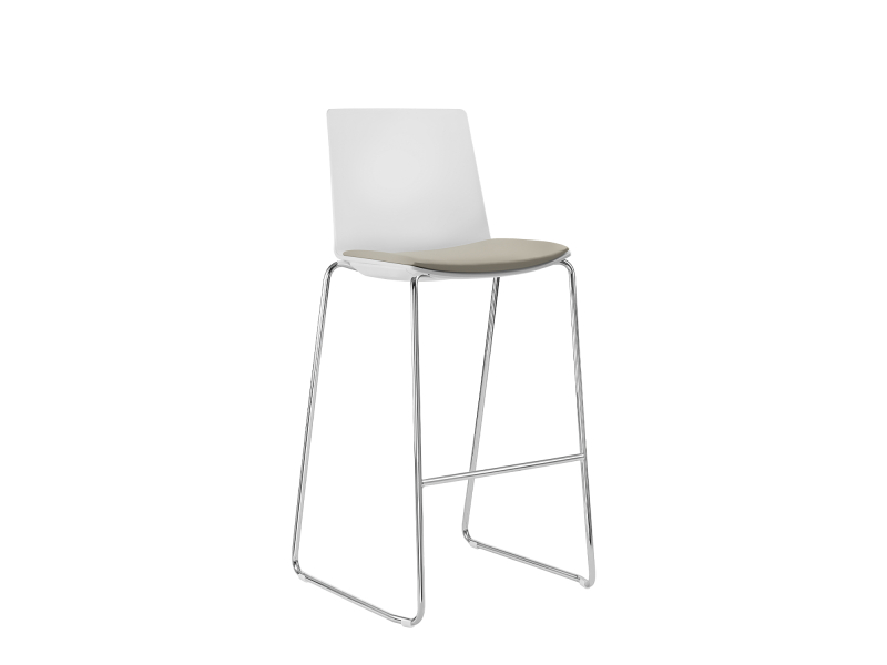 plastové kluzáky, bez područek, drátěná ocelová podnož v povrchové úpravě chrom, barová židle, čalouněný panel sedáku, plastový korpus, výška sedáku 660, nebo 760 mm