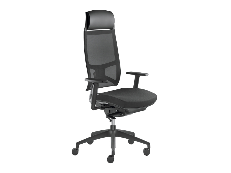 5-ramenný nylonový kříž, černý, kolečka na koberce, černá, Ø 60 mm, otočná pracovní židle, výškově stavitelná, základní verze bez područek, čalouněný sedák, síťovaný opěrák, synchronní mechanika TI s bočním nastavením tuhosti odporu opěráku a zvýšeným úhlovým rozsahem mezi sedákem a opěrákem, 11x aretace, výškově stavitelná hlavová opěrka, hliníkový držák opěráku v povrchové úpravě šedá prášková barva (RAL 9006), opěrák čalouněný černou nylonovou síťovinou, hloubkově stavitelný sedák s funkcí samostatného náklonu sedáku