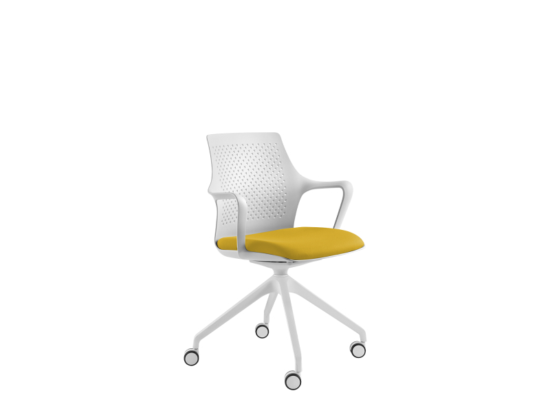 kolečka s pryží na tvrdé podlahy, bílá, Ø 55 mm, otočná konferenční židle, opěrák perforovaný, čalouněný sedák, plastový opěrák, 4-ramenný nylonový kříž, bílý, nylonové područky součástí korpusu