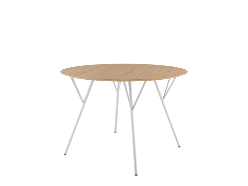 plastové kluzáky, 4-nohá ocelová podnož v povrchové úpravě bílá prášková barva, konferenční stolek, povrch stolu dubová dýha, nebo bílý laminát, výška podnože 720 mm, dřevěná deska z bukové překližky tloušťky 18 mm a průměru 1100 mm