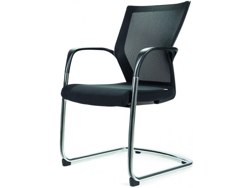Konferenční židle s ocelovou pérovou konstrukcí a pevnými plastovými područkami, čalouněný sedák, zádová opěra síťovaná, podnoží je opatřeno plastovými kluzáky, černá s chromovým rámem.